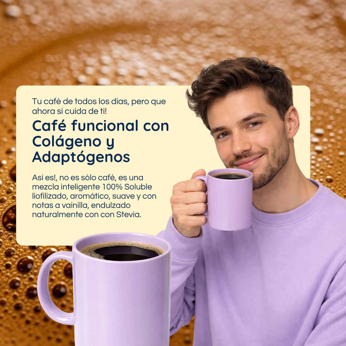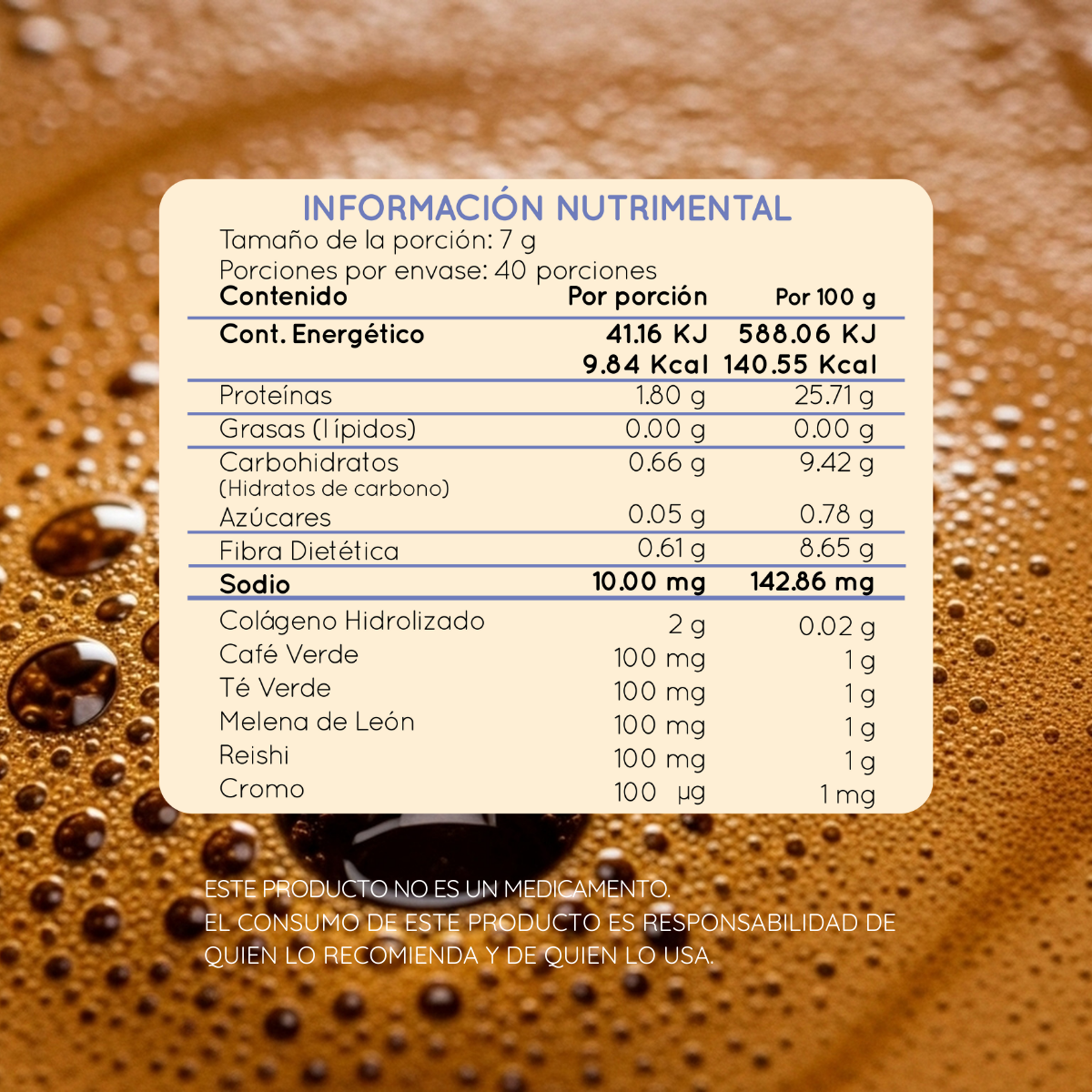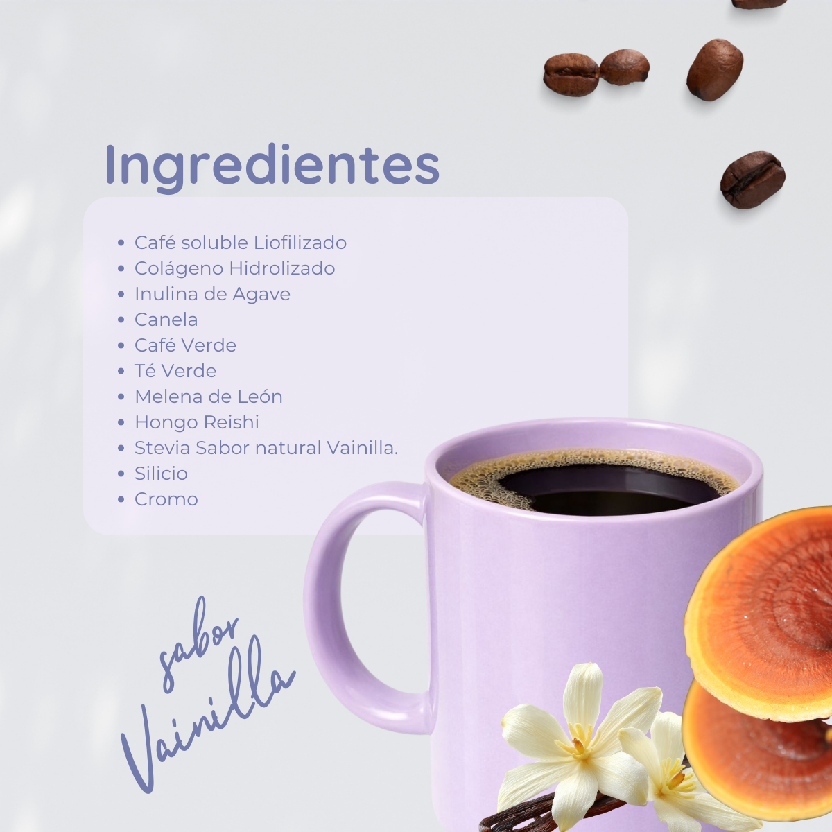 Con un delicioso sabor a vainilla, adicionado con Colágeno, Hongos Adaptógenos y Café verde.