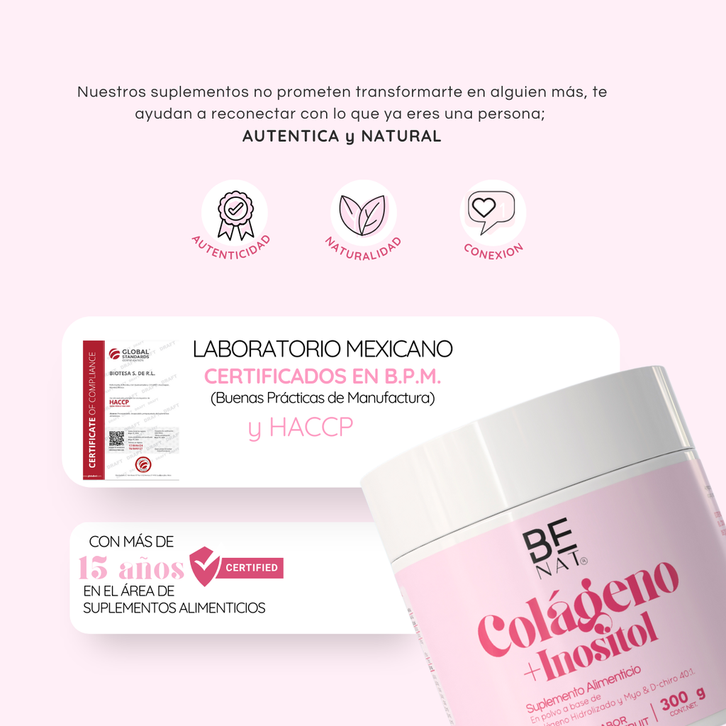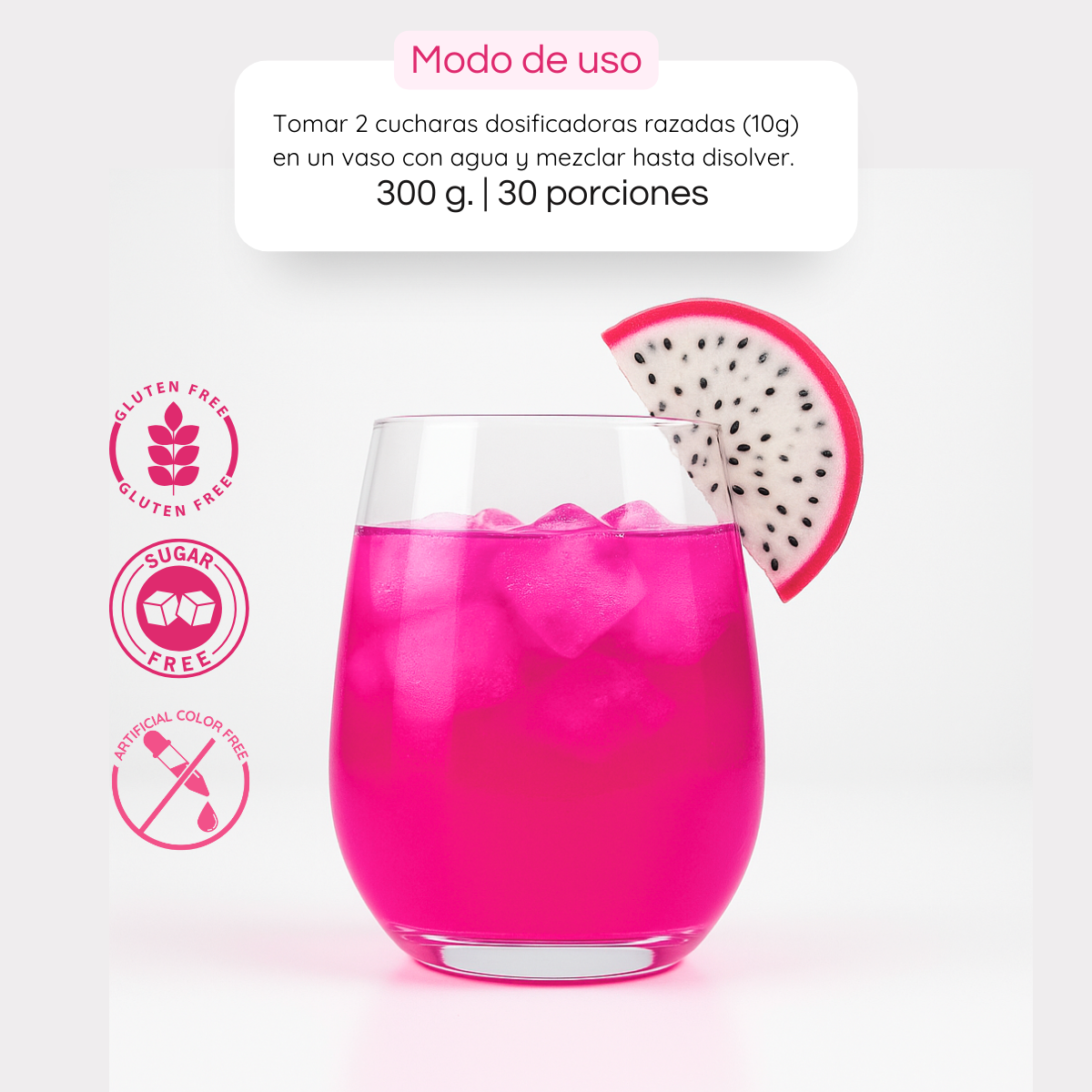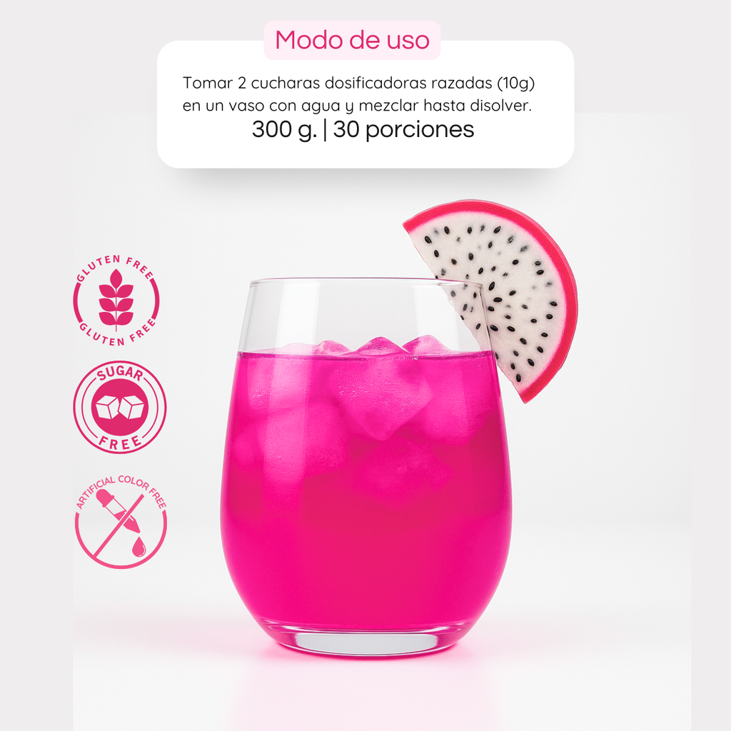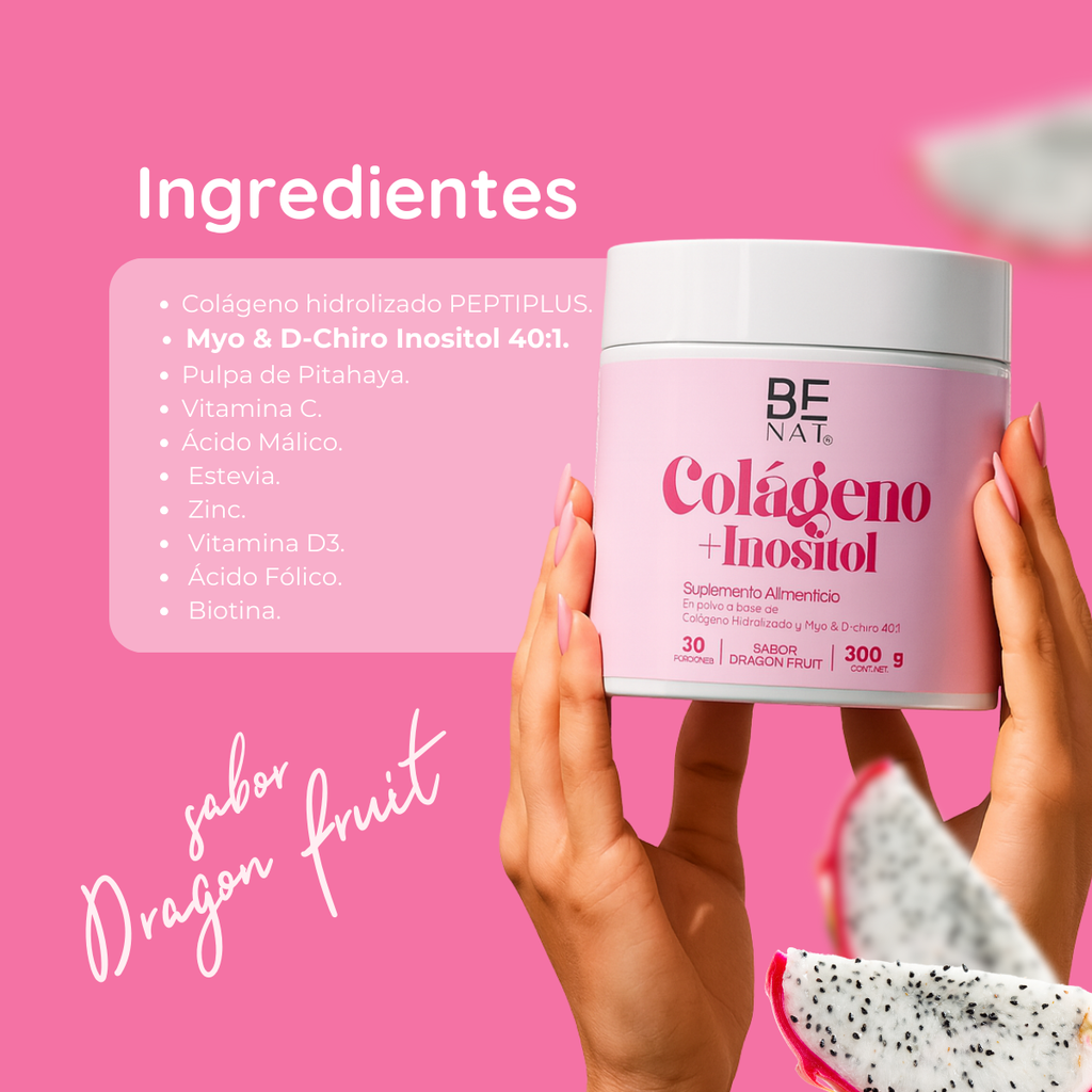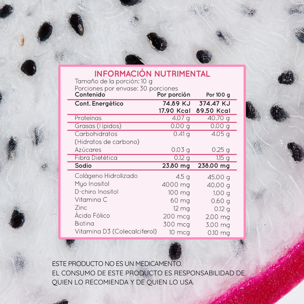 INGREDIENTES: Colágeno hidrolizado PEPTIPLUS, Myo & D-Chiro Inositol 40:1, Pulpa de pitahaya, Vitamina C, Ácido Málico, Estevia, Zinc, Vitamina D3, Ácido Fólico y Biotina