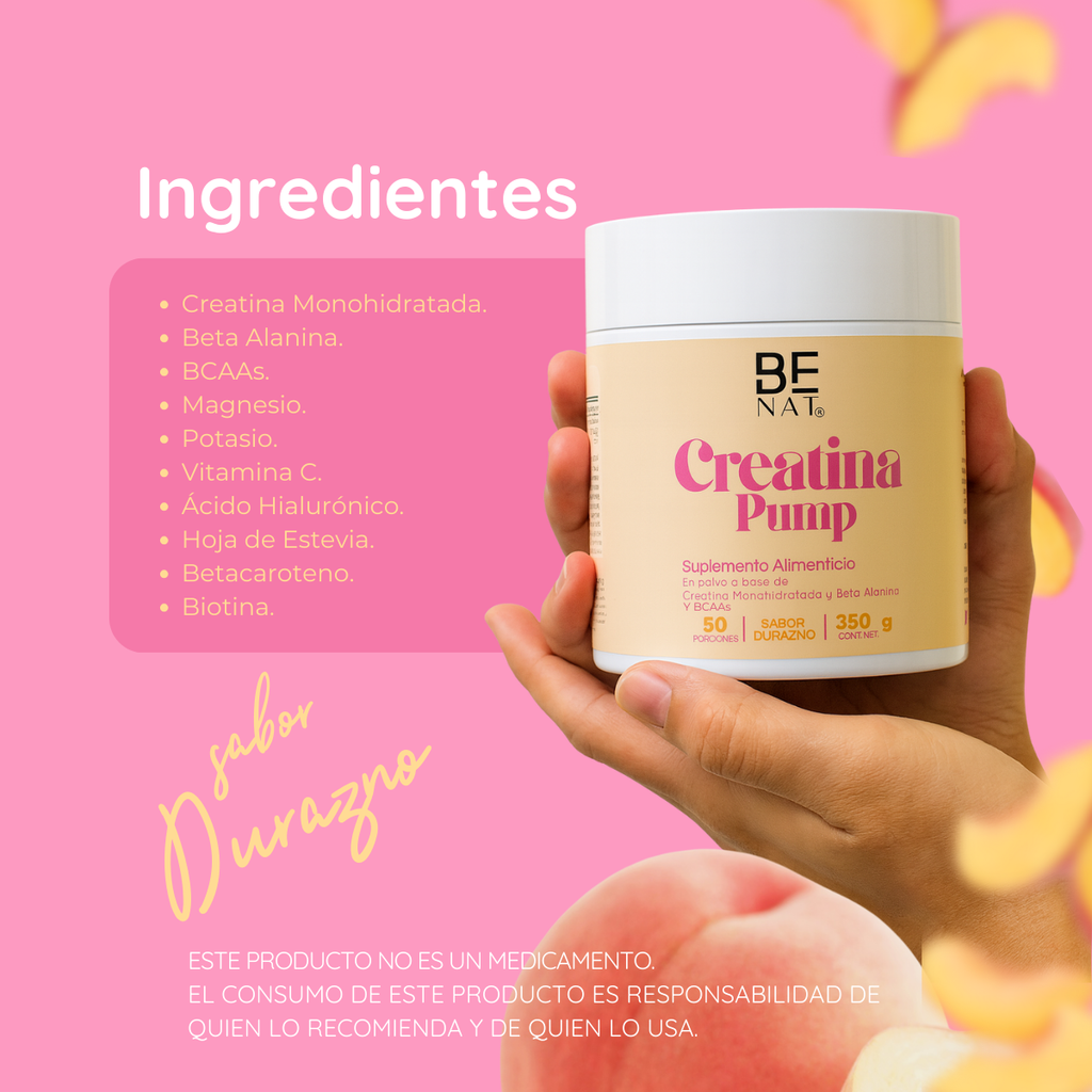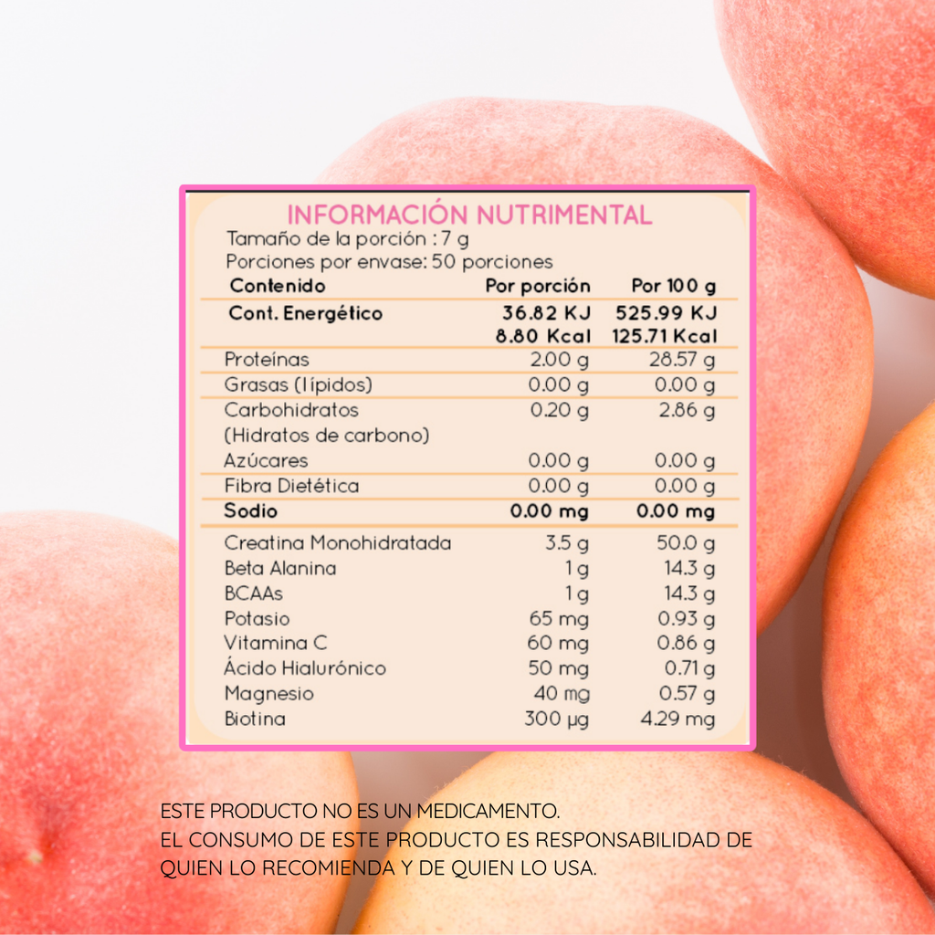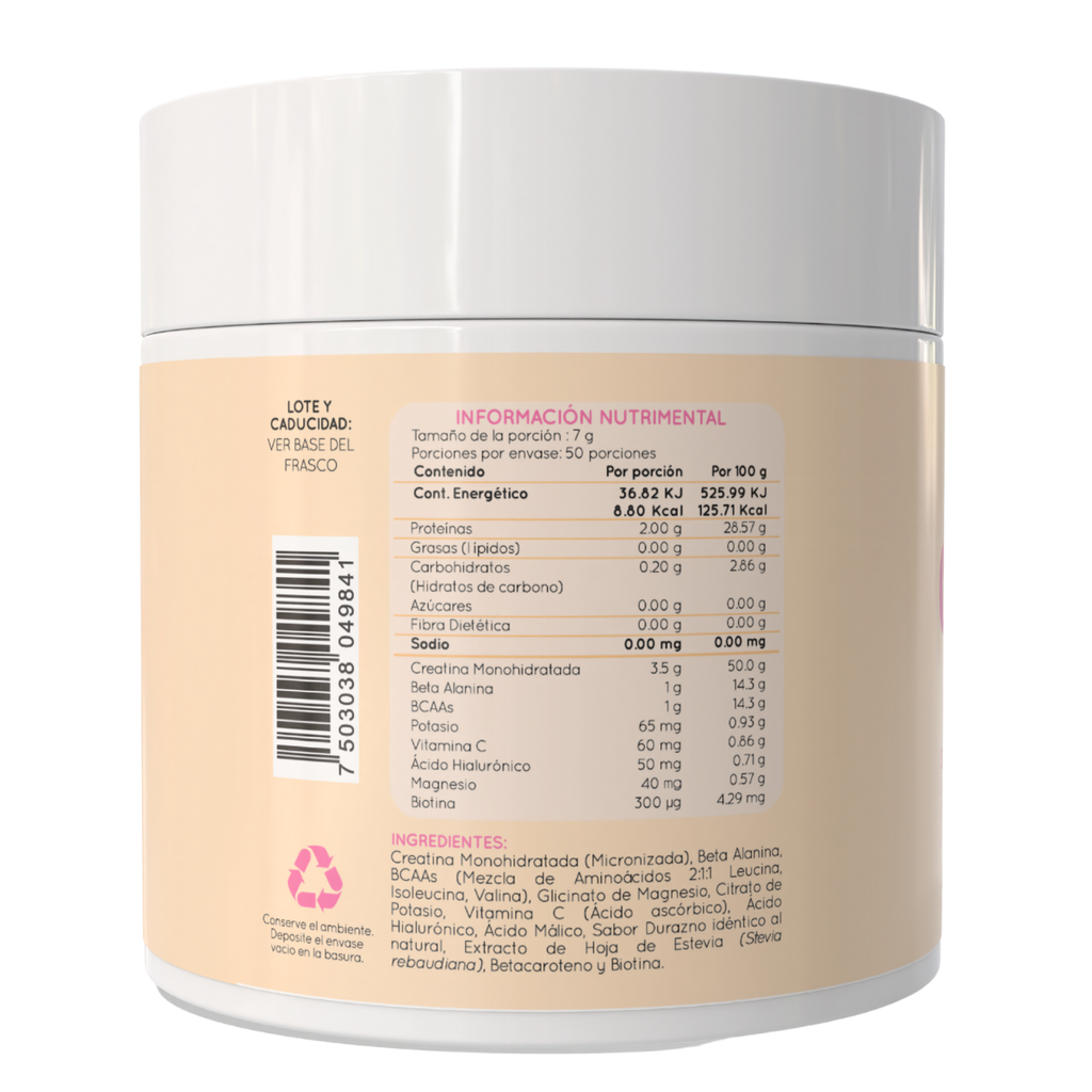 INGREDIENTES: Creatina Monohidratada, Beta Alanina, BCAAs, Magnesio, Potasio, Vitamina C, Ácido Hialurónico, Hoja de Estevia, Betacaroteno y Biotina.