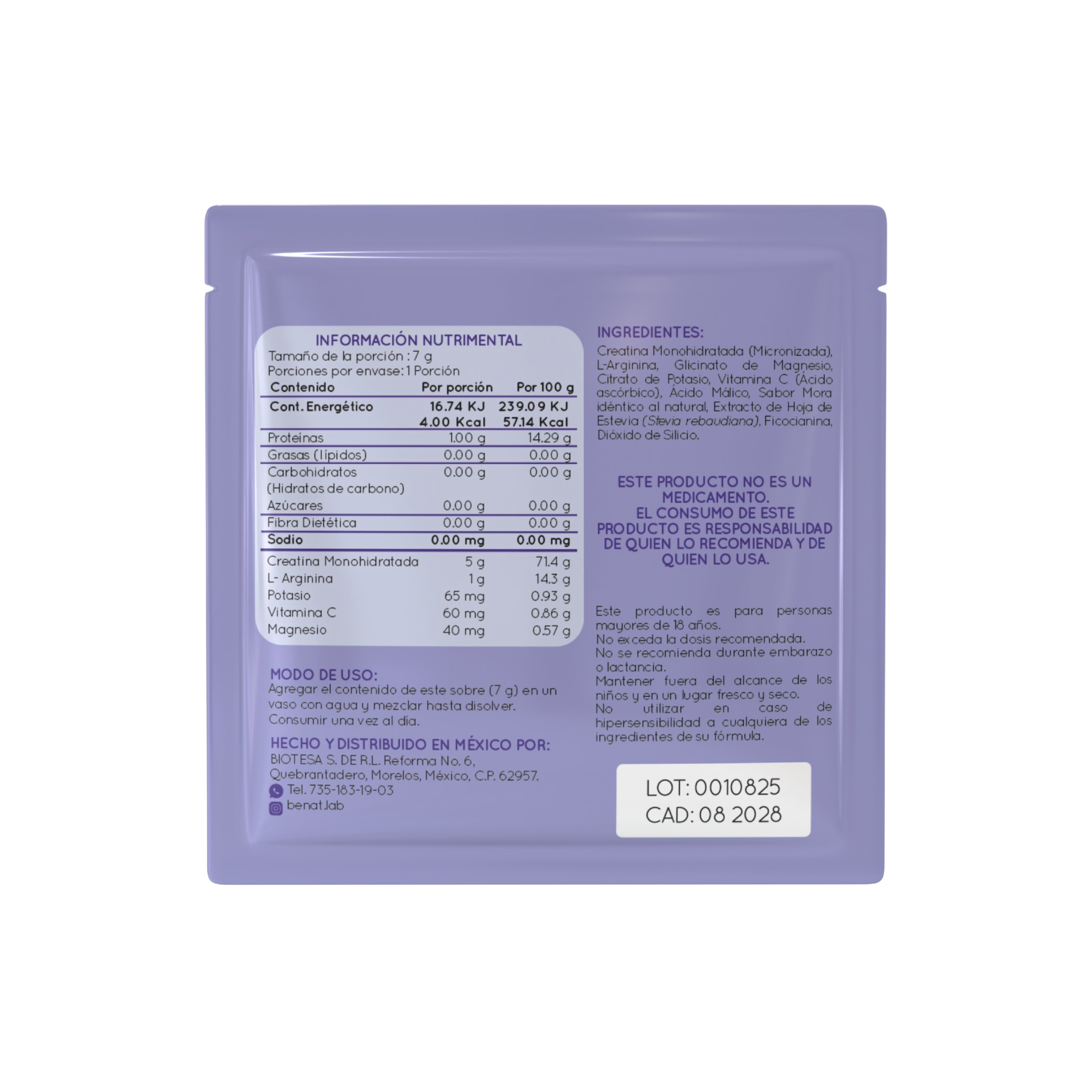 INGREDIENTES: Creatina Monohidratada, Beta Alanina, BCAAs, Magnesio, Potasio, Vitamina C, Ácido Hialurónico, Hoja de Estevia, Betacaroteno y Biotina.