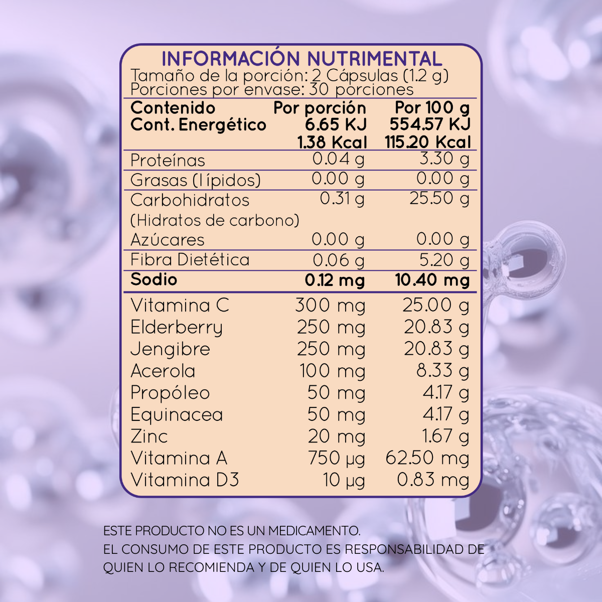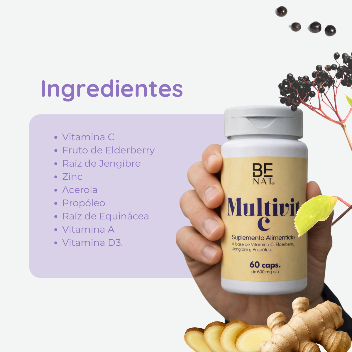 INGREDIENTES: Vitamina C, Fruto de Elderberry, Raíz de Jengibre, Zinc, Acerola, Propóleo, Raíz de Equinácea, Vitamina A y Vitamina D3.